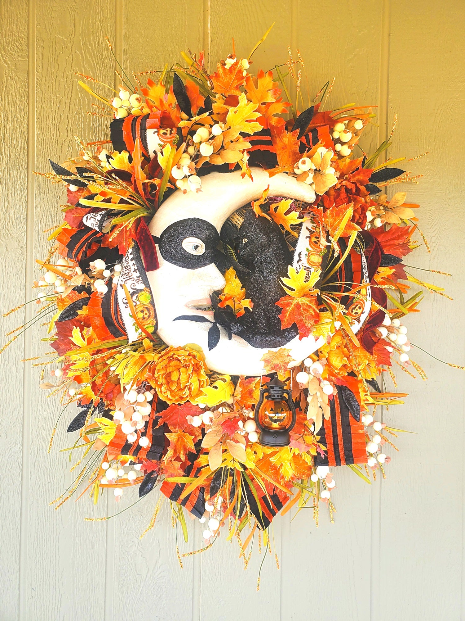 Welcome the spooky season with our Handcrafted Moon and Cat Halloween Wreath, a perfect blend of autumn harvest colors and Halloween spirit. This unique wreath features a striking black and white moon face with a black cat sitting on the moon, paired with vibrant orange, yellow, and black foliage, accented with berries, flowers, and a mini lantern. Ideal for adding a festive touch to your front door, this wreath is meticulously handcrafted to ensure high quality and durability. It's perfect for Halloween and fall decor, making it an excellent addition to your seasonal decorations. This wreath measures approximately 30 inches in diameter, making it a noticeable and attractive piece for any home. Embrace the fall season and celebrate Halloween with this eye-catching, one-of-a-kind wreath.