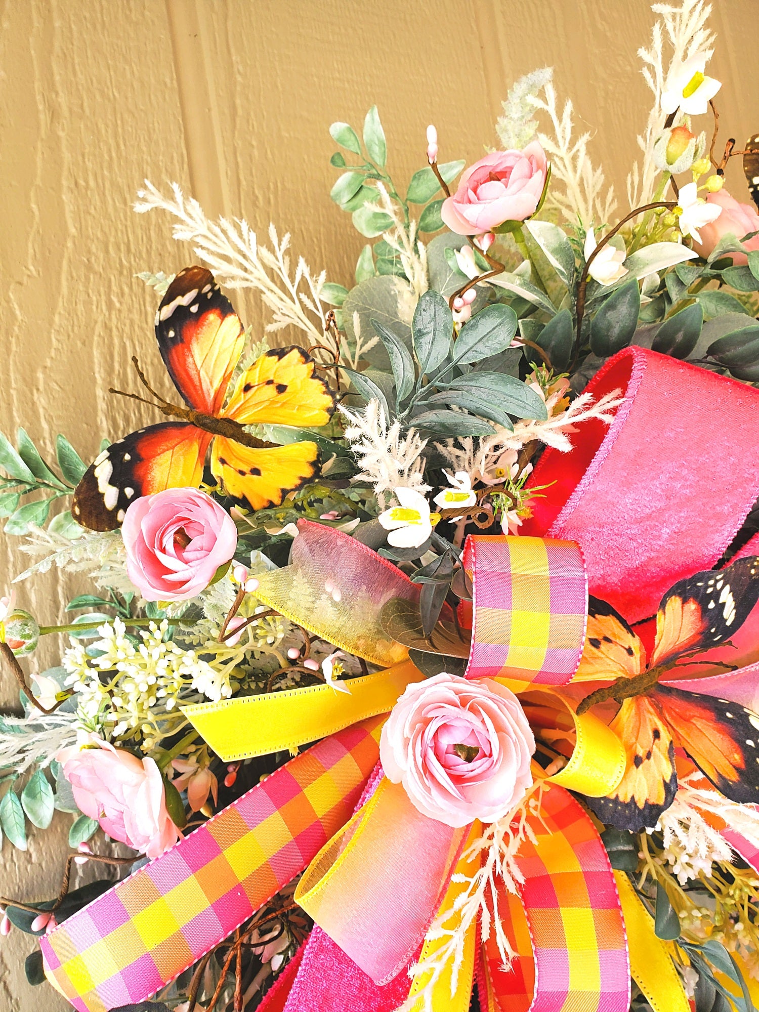 Welcome spring and summer in full bloom with this handcrafted butterfly wreath, bursting with pink ranunculus, lush greenery, and vibrant yellow-orange butterflies. This large grapevine wreath features a layered ribbon bow in pink and plaid, creating a whimsical statement for your front door, porch, or entryway.