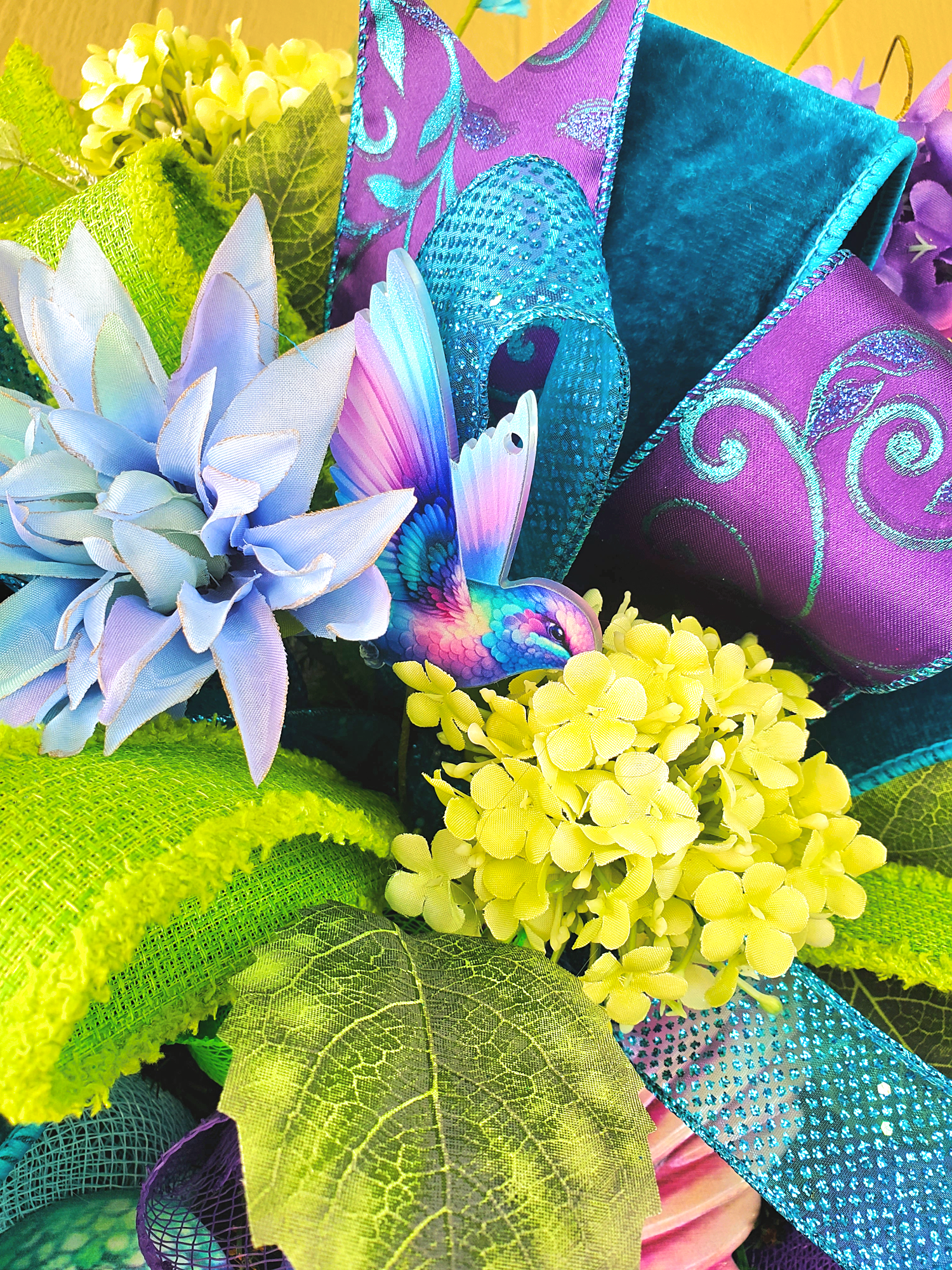 Welcome spring and summer with this breathtaking handmade hummingbird wreath bursting with vibrant colors and whimsical charm! Featuring detailed hummingbird accents, lush purple and blue florals, velvet and glittery ribbons, and delicate greenery, this wreath adds a vibrant pop of personality to any door or wall.